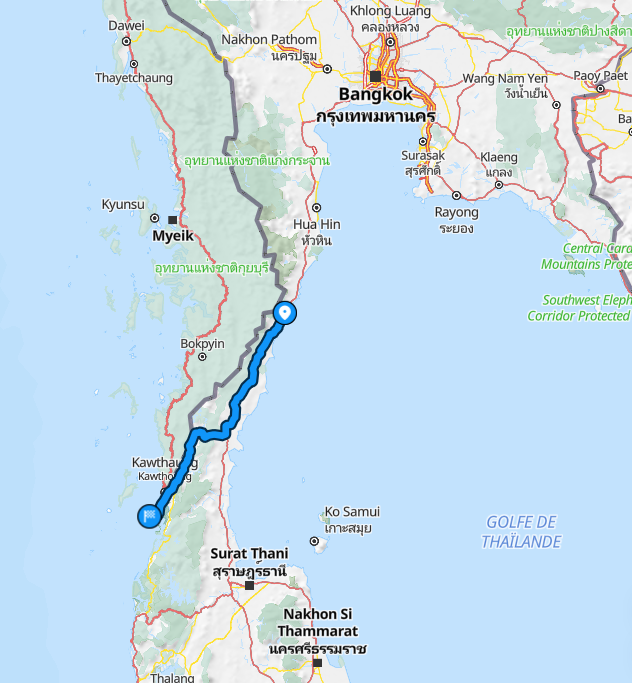 Le voyage du héros est un voyage de voyageur ! C'est une aventure. Elle allie la découverte d'une région et de deux mers (le littoral du golfe de Thaïlande et les iles de la mer d'Andaman) avec l'observation de soi, de sa vie intérieure, de ses émotions qui naissent des avatars du voyage, de la vie en groupe et de la rencontre des autres. Ici, c'est la Thaïlande provinciale, hors des sentiers touristiques battus mais pourvue d'infrastructures touristiques de qualité, de systèmes de transport moderne et sécurisé. Ce voyage existe autour d'un itinéraire (voir carte ci dessous) : nous avons un mois pour parcourir 350 kilomètres entre une ville côtière du golfe de Thaïlande et l'ile de Koh Phayam dans l'océan indien. Quelques traits caractéristiques de ce voyage :